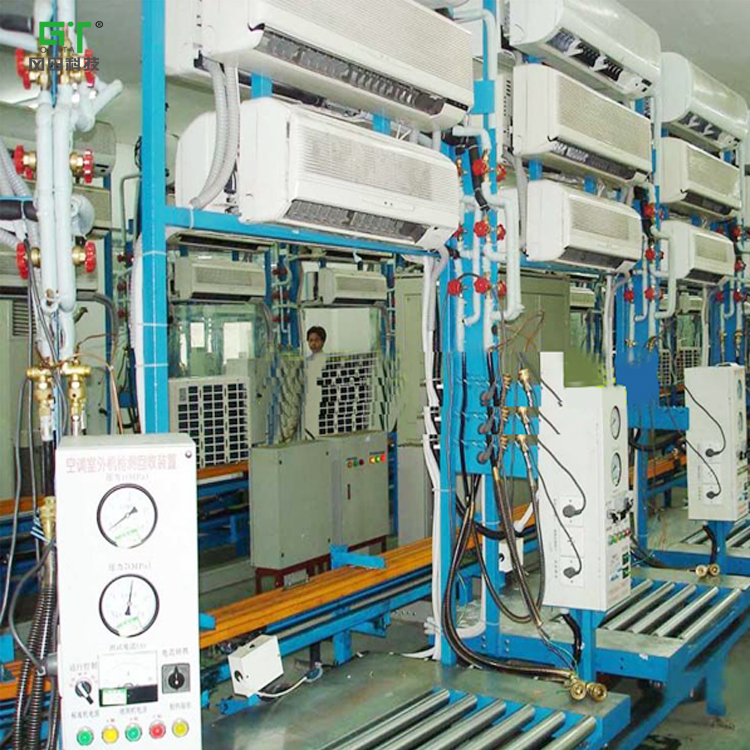 空調(diào)檢測線:用于各種空調(diào)器室內(nèi)、外機各性能參數(shù)的檢驗,整個系統(tǒng)具有穩(wěn)定可靠,精度高,操